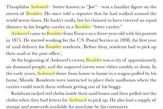 In 1900 Boulder Theophile "Ardowel " is a mail carrier, born Dec 1872 in France, married six years to Amelia born Oct 1877 in Ohio. She's had three kids. Francis J. Jan 1895, Clement A. Dec 1896, and LaFayette May 1899, all in Colorado..
